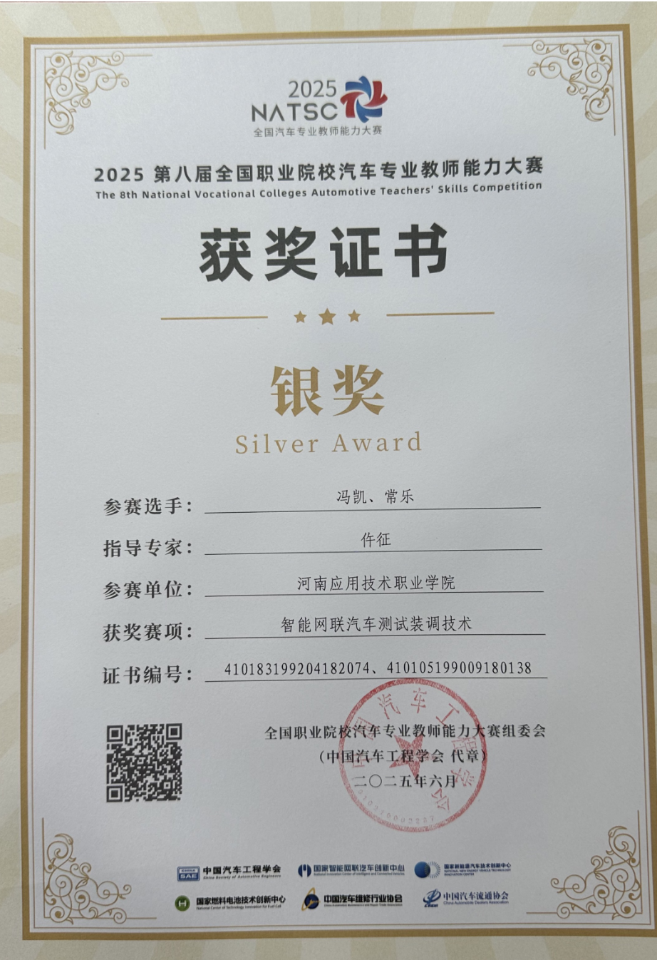 2025年6月22日,第八届全国职业院校汽车专业教师能力大赛“风向标杯”智能网联汽车测试装调技术赛项正式拉开帷幕,经过两天的激烈角逐,公司教师冯凯、常乐老师在副经理仵征带队下获得高职组银奖。