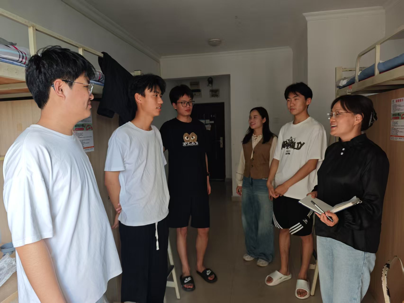 5月18日下午,孙丽娜与邢梦怡首先来到员工公寓,仔细查看宿舍居住环境,关切询问员工生活需求。孙丽娜语重心长地叮嘱员工:“从教室坐着、宿舍躺着到站着工作,不仅是工作形式的转变,更需要强大的心理调适能力,公司永远是你们的坚实后盾。”作为心理专员,邢梦怡敏锐捕捉到部分员工初入职场的紧张情绪,用亲切的话语舒缓他们的压力,引导员工分享适应工作生活过程中的感受。