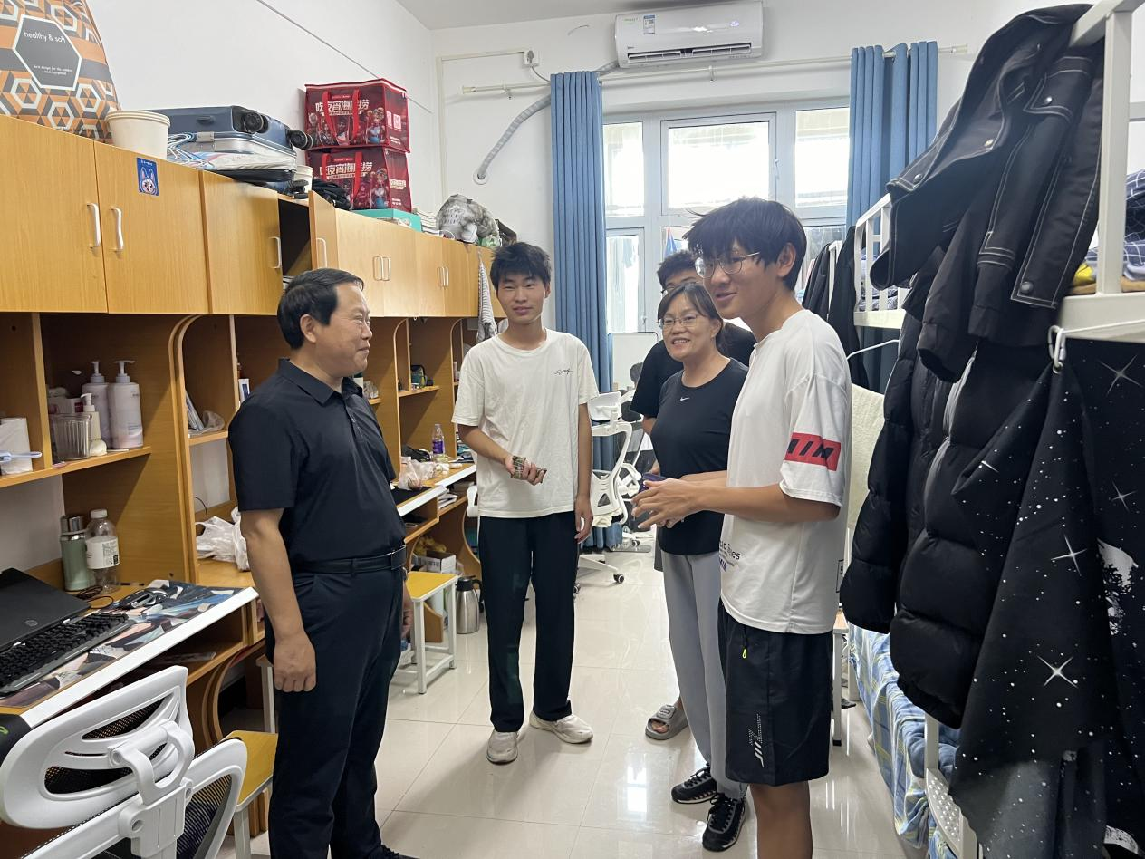 常新中一行首先来到员工宿舍,与留校员工进行了面对面的交流。常新中仔细询问同学们留校的原因,了解他们近期的学习计划和生活状况,并鼓励大家合理安排作息时间,在努力学习的同时,也要注意劳逸结合,保持良好的身心状态。